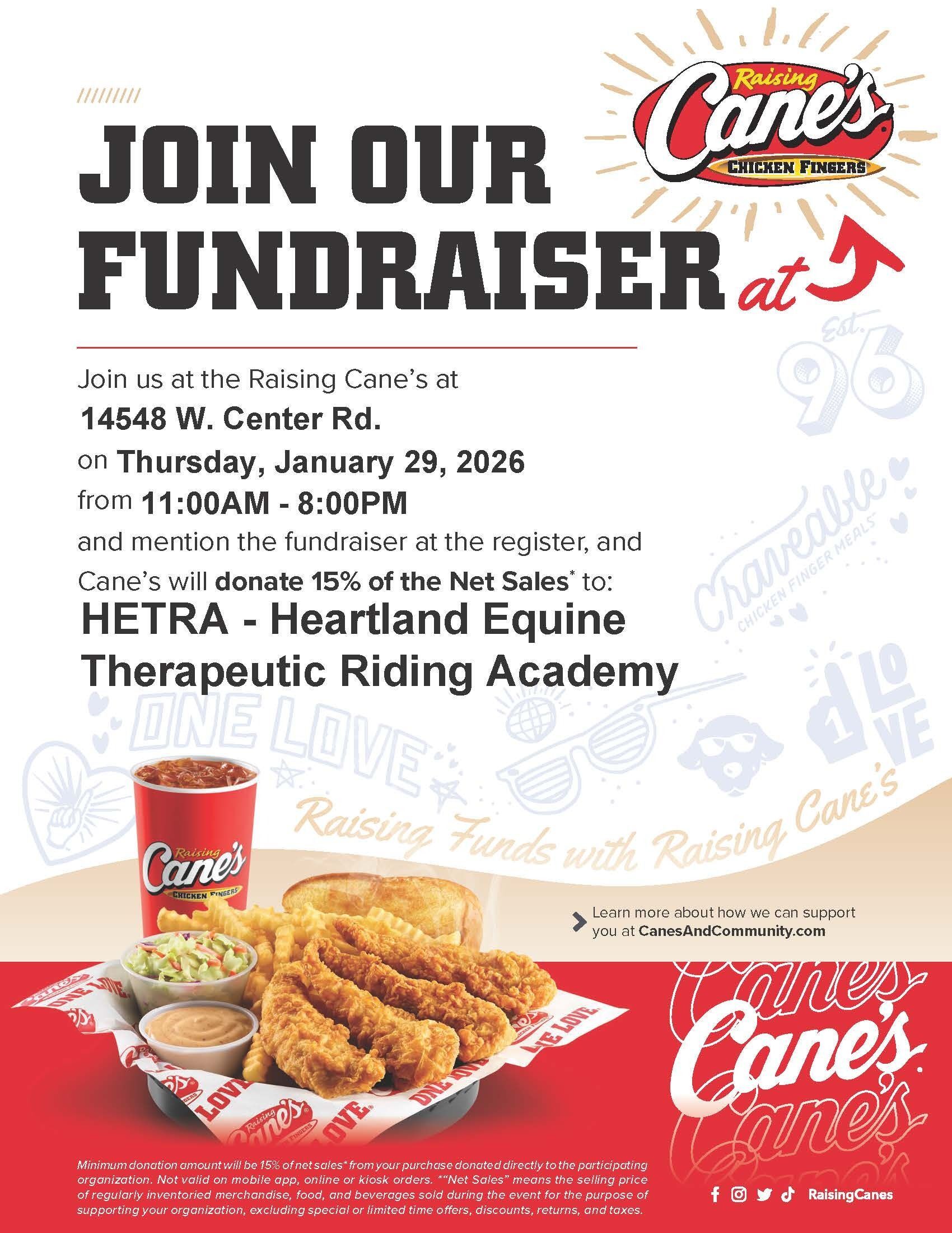 Join us on Thursday, January 29th from 11 AM - 8 PM, mention the HETRA Fundraiser, and Cane's will donate 15% of Net Sales to us!